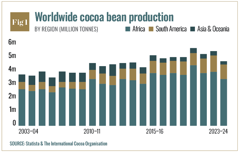 “When the Ivory Coast and Ghana sneeze, global chocolate catches a cold. Cocoa just had its ‘oil moment’: a near 500,000-ton global deficit in 2023–24 pushed inventories to multi-decade lows and sent futures above $10,000/ton at the peak in January 2025,” Francisco Martin-Rayo, co-founder and CEO at Helios AI, said. One of the biggest reasons for this was the El Niño weather pattern in the 2023–24 season. This caused volatile weather patterns, such as unusually heavy rain, followed by hotter and drier weather across key cocoa-producing countries such as Ghana and the Ivory Coast. Cocoa is very sensitive to weather changes as it grows only in limited areas of warm, humid equatorial conditions, with 70 percent of the crop coming from West Africa (see Fig 1). These temperature extremes caused decreased cocoa yields and a rise in crop diseases such as swollen shoot virus and brown rot. The diseases also meant that the remaining yield was of lower quality, further escalating prices. Aging West African cocoa trees are another factor contributing to higher prices. These can severely dampen yield capacity because of decreased soil fertility. Older trees can also be more vulnerable to diseases and pests and become weaker with time.