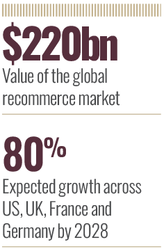 A recent report, Second-Hand, First Choice: The Psychology of Recommerce by Retail Economics and MPB, values the global recommerce market (excluding cars) at around $220bn – and it is expected to grow by almost 80 percent by 2028 across the US, UK, France and Germany.